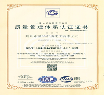 獲得了GB/T19001-2016/ISO19001:2015版質(zhì)量管理體系認證書,GB/T24001-2016/ISO14001:2015版環(huán)境管理體系認證證書,ISO45001:2018版職業(yè)健康管理體系認證證書,通過了省,市安全,環(huán)保考評,監(jiān)測頒證,獲得“安全生產(chǎn)標準化”三級企業(yè)證書!